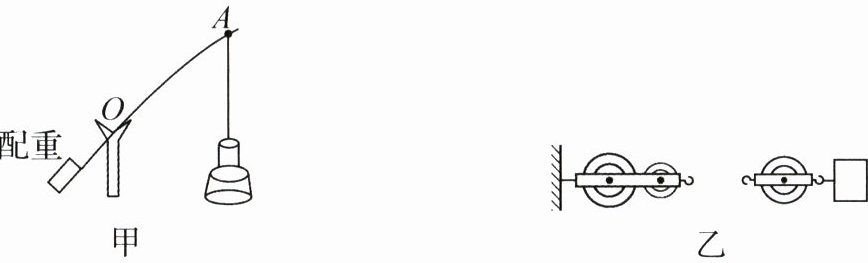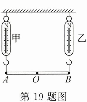 19. 如图所示,质量分布不均匀的木条$AB$重24N,木条长度为1m,$A$、$B$是木条的两端,$O$是木条的中点,此时弹簧测力计乙的示数为6N,则该木条的重心在距$A$端____m的位置;当以$B$端为支点时,甲的示数为____N。