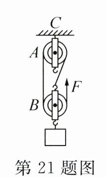 21. 如图,工人用$A$、$B$两个相同的滑轮组成的滑轮组提升重540N的物体,所用的拉力$F$为200N,物体以0.2m/s的速度匀速上升了10s。不计绳重及摩擦,拉力$F$所做的功为____J,$C$处天花板受到的拉力为____N;若匀速提升重240N的物体,滑轮组的机械效率为____。