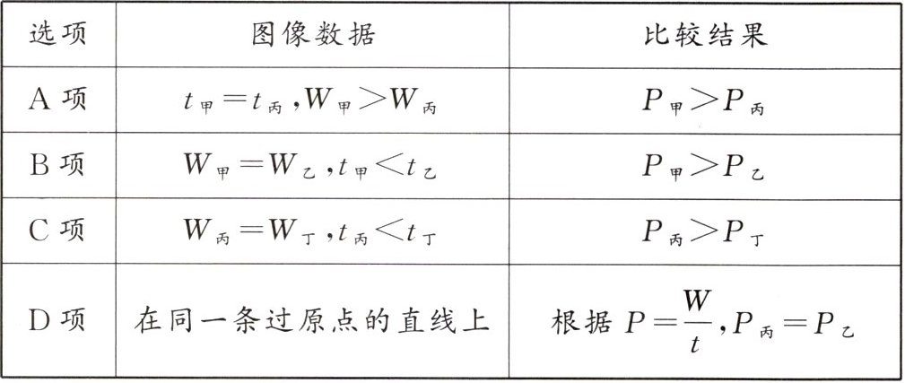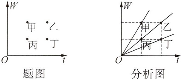 典例3(2025·江苏苏州期中)小明对四位同学做功情况各测量了一次,把四位同学做功W和所用时间t在坐标系中描点,得到了图中甲、乙、丙、丁四个点,这四个同学中做功功率相同的是()