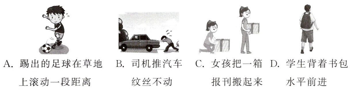 【思路分析】A项足球滚动的过程中,人没有对足球施加力的作用,人没有对足球做功;B项司机对汽车施加了力的作用,但是汽车没有在力的方向上移动,人没有对汽车做功;C项女孩对报刊施加了向上的作用力,报刊向上移动了一段距离,女孩对报刊做了功;D项学生对书包的作用力竖直向上,书包沿水平方向运动,运动方向与力的方向垂直,学生没有对书包做功。