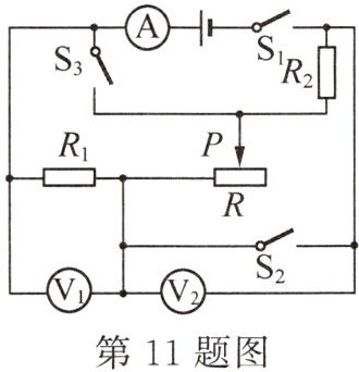 11. (2分)如图所示的电路中,电源电压$U = 24V$保持不变.只闭合开关$S_{1}和S_{3}$,电流表A的示数为$I_{1}$;只闭合开关$S_{1}和S_{2}$,电流表A的示数为$I_{2}$,$I_{1}:I_{2}= 1:2$,则$R_{1}与R_{2}$的阻值之比为____;将滑动变阻器的滑片P置于某位置a,其接入电路的电阻值为$R_{a}= 12Ω$,闭合开关$S_{1}$,断开$S_{2}$、$S_{3}$,电压表$V_{1}的示数为U_{1}$,电流表A的示数为$I_{3}$,再将滑动变阻器的滑片置于最右端,电流表A的示数为$I_{4}$,电压表$V_{2}的示数为U_{2}$,$U_{1}:U_{2}= 2:7$,$I_{3}:I_{4}= 2:1$,则闭合开关$S_{1}$、$S_{2}和S_{3}$,移动滑动变阻器的滑片,电流表A示数的最小值为____A.