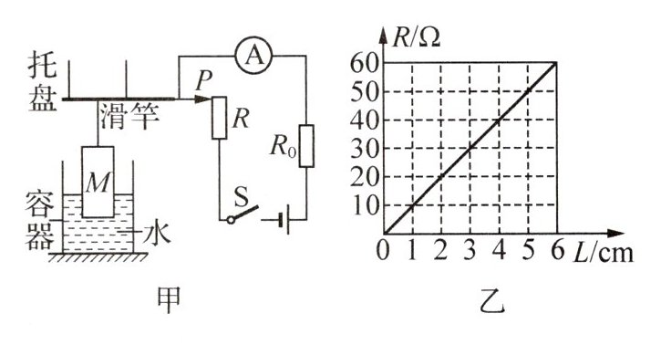 12. (2024·四川南充·8分)科创小组设计利用电流表测量质量的装置如图甲.现截取适当长度的电阻片R(它的阻值随长度L的变化图像如图乙所示)作为滑动变阻器接入电路.图甲中,电源电压为6V恒定不变,电流表量程为0~0.6A,当滑片P在最下端时,电流表示数为0.6A.装置中托盘与圆柱形实心塑料浮筒M通过硬质绝缘细杆固定连接,整体漂浮在装有足够深水的柱形薄壁容器中,且只能竖直移动.托盘的质量为0.27kg;M高22cm,底面积为300cm^2,质量为0.33kg;容器的底面积为400cm^2.托盘通过滑竿带动滑片P上下移动,托盘中未放物体时,调节水量,使滑片P正好位于R最上端;托盘中放入物体A时,M刚好浸没,滑片P正好位于R最下端.($g$取10N/kg,$\rho_{水}= 1.0×10^{3}kg/m^{3}$,不计滑片、滑竿、细杆的质量,忽略摩擦阻力,工作中水不溢出)求:
