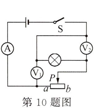 10. (2025·江苏南京月考·2分)如图所示的电路中,电源电压不变,不考虑灯丝电阻随温度的变化.当开关S闭合,滑片P置于变阻器的b端时,电压表$V_{1}$示数为12V,电流表示数为0.4A;当滑片P移至变阻器的中点时,电压表$V_{2}示数恰等于V_{1}$示数的一半,则变阻器最大阻值为____Ω;滑片由变阻器的b端移至中点过程中,通过灯泡的电流变化了____A.