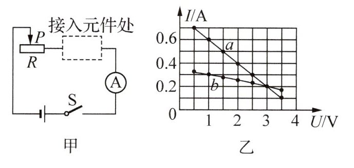 C 解析:由图甲可知,闭合开关,定值电阻(或小灯泡)和滑动变阻器串联,由$U=IR$可知,定值电阻(或小灯泡)两端的电压随电流的增大而增大,则滑动变阻器两端的电压随电流的增大而减小,由图乙可知,电压表测滑动变阻器两端的电压,即电压表与滑动变阻器并联,定值电阻的阻值不变,小灯泡的电阻是变化的,所以a是接入定值电阻时绘制的图线,b是接入小灯泡时绘制的图线。由图乙可知,接入定值电阻,当滑动变阻器两端的电压为0.5V时,电路中电流为0.7A,当滑动变阻器两端的电压为3.5V时,电路中电流为0.1A,由欧姆定律可得,电源电压$U=0.7A×R_{定}+0.5V=0.1A×R_{定}+3.5V$,解得$R_{定}=5Ω$,则电源电压$U=0.7A×5Ω+0.5V=4V$,故A、B错误;定值电阻和小灯泡两端的电压各为3.5V时,滑动变阻器两端的电压为$4V - 3.5V = 0.5V$,由图乙可知,此时通过定值电阻的电流大于通过小灯泡的电流,由$R=\frac {U}{I}$可知,小灯泡的电阻较大,故C正确;接入小灯泡后,将滑片P向右移动时,滑动变阻器接入电路的阻值变小,由串联分压可知,电压表的示数将变小,故D错误。