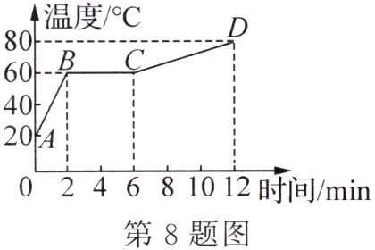 8. (2025·河南郑州月考)用稳定的热源给一个0.5kg的物体均匀加热,得到它的熔化图像如图所示,已知该物体在固态时的比热容为$0.2×10^3J/(kg·℃),$由此可得该物体在BC段熔化过程中吸收的热量为______J;则该物质在液态时的比热容为______J/(kg·℃).