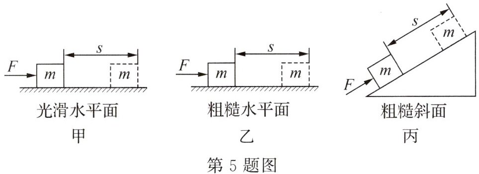 5. (2025·江苏常州期中·2分)如图所示,物体在相同大小的推力F的作用下,分别在光滑水平面、粗糙水平面和粗糙斜面上沿力的方向移动了相同的距离s,所用时间分别为t、2t、3t.该过程中力F做的功之比$ W_{甲}:W_{乙}:W_{丙}= $______,其功率$ P_{甲} $、$ P_{乙} $、$ P_{丙} $中最大的是______.