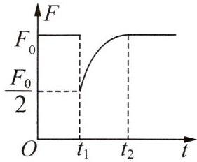 【变式3】一辆汽车在平直公路上以速度$v_{0}$匀速行驶,发动机功率为$P_{0}$,牵引力为$F_{0}$。$t_{1}$时刻开始,司机减小了油门,使汽车保持恒定功率P行驶,到$t_{2}$时刻,汽车又开始做匀速直线运动,速度为v。已知运动过程中汽车所受阻力f恒定不变,汽车牵引力F随时间t变化的图像如图所示,则()