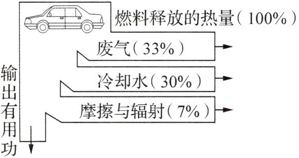 C 解析:该车发动机的效率η=100%-33%-30%-7%=30%,故A错误;0.1kg的乙醇汽油完全燃烧时释放的能量$Q_{放}=mq=0.1kg×4.6×10⁷J/kg=4.6×10⁶J,$而乙醇汽油不可能完全燃烧,放出的热量比4.6×10⁶J少,故B错误;利用废气的能量及减小摩擦可以减少热机的能量损失,提高热机效率,故C正确;发动机压缩冲程把机械能转化为内能,故D错误.