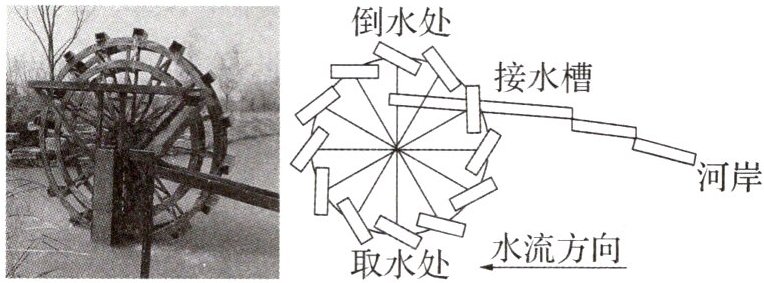 6. 新趋势 传统文化 (2025·江苏盐城期中)《天工开物》是我国古代的科学著作,书中记载着大量的古代农业机械.其中这样写道:“凡河滨有制筒车者,堰陂障流,绕于车下,激轮使转,挽水入筒,一一倾于枧内,流入亩中,昼夜不息,百亩无忧.”该段文字描述了筒车这样一种以水流作动力,用来取水的机械.如图所示,若接水槽离取水处高4 m,水轮上有12个取水筒,一个取水筒每次可取水4 kg,筒车旋转一周所用时间为60 s,水流冲击筒车的功率为40 W.(接水槽离倒水处的高度忽略不计,g取10 N/kg)