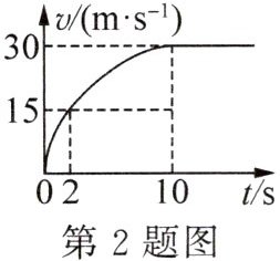 2. 汽车出厂前需要测试,某次测试过程中,汽车保持恒定功率在水平路面做直线运动,其v-t图像如图所示.汽车运动过程中受到的阻力不变,发动机效率为40%,加速至2s时牵引力为4000N,10s后油箱还剩10L汽油(汽油的热值$q= 3.3×10^7J/L),$则汽车的功率为______kW.运动中汽车受到的阻力为______N,10s后该车最多还能继续行驶的路程为______km.