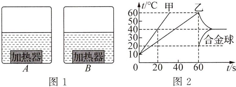 4. (2025·湖北黄石期中)如图1,A、B是两个底部装有完全相同的加热器的容器,加热器产生热量的90%可以被容器中的液体吸收,已知加热器每秒钟放出热量1000J.现将甲、乙两种液体分别倒入A、B两容器中,其中甲液体的比热容为$2×10^3J/(kg·℃);$让两个加热器同时开始工作,60s后停止加热,然后立即将质量为2.7kg的合金球迅速放入乙液体中(从球放入到达到热平衡不计热损失),它们的温度随时间变化的图像如图2所示.求: