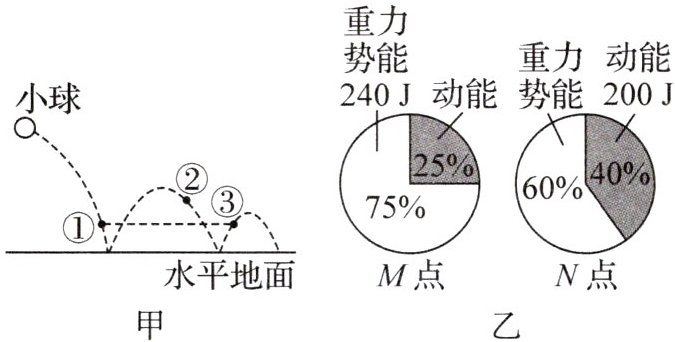 D 解析:由图乙可知,小球在M点时的机械能$E_{M}=\frac{240J}{75\%}=320J$,动能$E_{M动}=E_{M}-E_{M势}=320J - 240J = 80J$,小球在N点时的机械能$E_{N}=\frac{200J}{40\%}=500J$,重力势能$E_{N势}=E_{N}-E_{N动}=500J - 200J = 300J$,可知小球在N点时的机械能大于在M点时的机械能,且在N点时重力势能较大,而小球在运动过程中,机械能不断减小,且位置①和③离地高度相等,小球在此两点时重力势能相等,所以N点对应的是②,M点对应的是③,在M点的重力势能小于在N点的,故A、C不符合题意;由以上分析可知,小球在点③的动能80J比在点②的动能200J小,所以小球在点③的速度比在点②小,故B不符合题意;小球在点①时的重力势能与在点③时的重力势能相等,为240J,小球在运动过程中,机械能不断减小,所以小球在点①时的机械能大于在点②时的机械能500J,即$E>500J$,$E_{势}=240J$,则它在点①的动能$E_{动}=E - E_{势}>500J - 240J = 260J$,所以小球在点①的动能大于260J,故D符合题意。