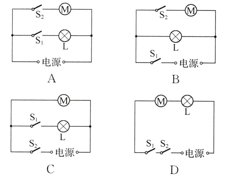6. (2024·重庆 B 卷)家用电动窗帘的电路主要由电源指示灯 L 和电动机 M 组成.先闭合开关$S_{1}$,电源指示灯 L 亮;再闭合开关$S_{2}$,电动机 M 工作拉动窗帘;当$S_{1}$断开时,电动机 M 不能工作.如图所示电路中符合要求的电路是 ()