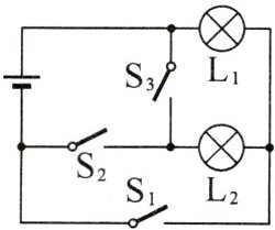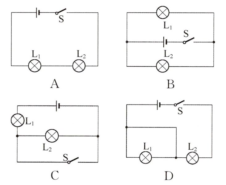 1. 下列图示电路中,当开关 S 闭合时,灯泡$L_{1}$、$L_{2}$组成的电路为并联电路的是 ()