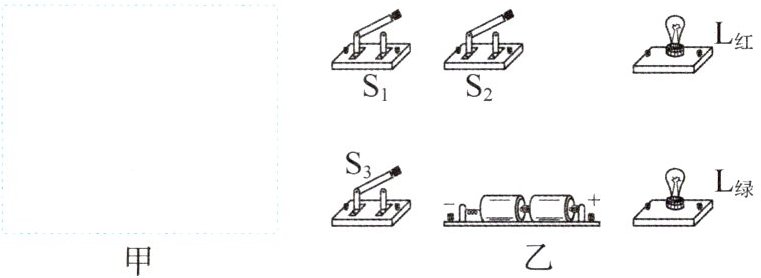 11. 某保密室有三道门,关上一道门相当于闭合一个开关,只要有一道门没有关上,红色和绿色的指示灯都会发光;三道门都关上时,红灯会熄灭,只有绿灯发光.请设计出符合要求的电路图画在图甲的虚线框内,并根据所设计的电路图在图乙中用笔画线将实物连接成符合要求的电路.(连线不能交叉,线头接在接线柱上)