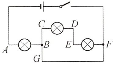 $BF$(或$GF$) $AD$(或$AE$) 解析:分析电路图可知,若想组成一个串联电路,即只有一条电流的路径,可以去掉导线$BF$或$GF$.分析电路图可知,如果将$A$和$D$或$E$连接起来,则三盏灯就并列地连接在一起,即变成并联电路,所以可以将$A$和$D$或$E$连接在一起,则只增加一根导线$AD$或$AE$即可.