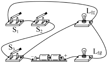 只要有一道门没有关上,红色和绿色的指示灯都会发光,说明三个开关相互影响,它们是串联的;当三道门都关上即三个开关都闭合时,红灯会熄灭、绿灯会发光,说明三个开关应与绿灯串联、与红灯并联.