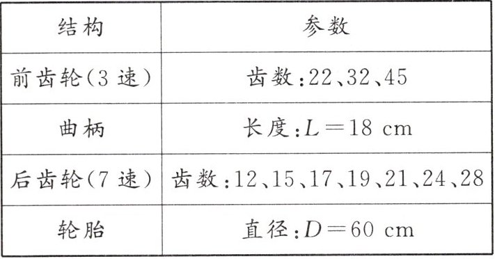 变速自行车与普通自行车的区别是它的前、后齿轮由多个齿数不同的齿轮组成.变速系统可以调节链条和不同齿数的前、后齿轮配合,即调节齿比$(\frac{前齿数}{后齿数}),$从而改变车速.下表是小明的变速自行车的部分参数.