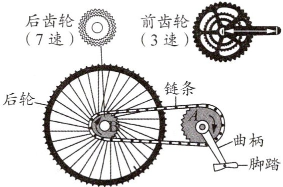 (2) 小明调节自行车齿比为$\frac{45}{15},$当他通过蹬脚踏使前齿轮转动1圈,后轮转动______圈.