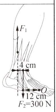 解:如图,将右脚看作杠杆,抬脚跟时脚绕支点O转动,动力为F_1,阻力为F_2.根据杠杆的平衡条件可得F_1l_1= F_2l_2,则小腿肌肉拉力$F_1= \frac{F_2l_2}{l_1}= \frac{300N×12cm}{4cm}= 900N.$错题改正