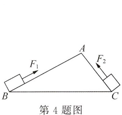 4.(2分)如图所示,光滑斜面的长度$ AB>AC $,沿斜面$ AB 和 AC 分别将同一重物从它们的底部拉到顶部 A $,所需拉力分别为$ F_{1} 和 F_{2} $,拉力所做的有用功分别为$ W_{1} 和 W_{2} $,两个斜面的效率分别为$ \eta_{1} 和 \eta_{2} $,则$ W_{1} $______$ W_{2} $,$ \eta_{1} $______$ \eta_{2} $.(均选填“>”“<”或“=”)