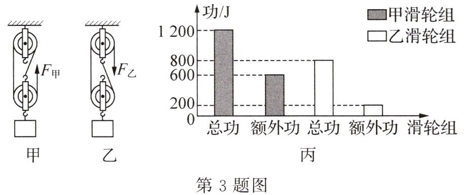B 解析:由图可知,两滑轮组承担物重的绳子段数$n_{甲}=3$、$n_{乙}=2$,将同一物体提升相同高度,由$s=nh$可知,甲滑轮组绳子自由端移动距离较大,故A错误;由图丙知,$F_{甲}$做的总功为1200J,$F_{乙}$做的总功为800J,$F_{甲}$做的功更多,故B正确;两个滑轮组将同一物体匀速提升相同高度,由$W_{有用}=Gh$可知,甲滑轮组的有用功等于乙滑轮组的有用功,$F_{甲}$做的总功更多,由$η=\frac {W_{有用}}{W_{总}}×100\% $可知,甲滑轮组的效率小于乙滑轮组的效率,故C错误;由图丙知,乙滑轮组的额外功$W_{额外}=200J$,由$W_{总}=W_{有用}+W_{额外}$和$η=\frac {W_{有用}}{W_{总}}×100\% $可得,乙滑轮组的机械效率$η=\frac {W_{总}-W_{额外}}{W_{总}}×100\% =$$\frac {800J-200J}{800J}×100\% =75\% $,故D错误.