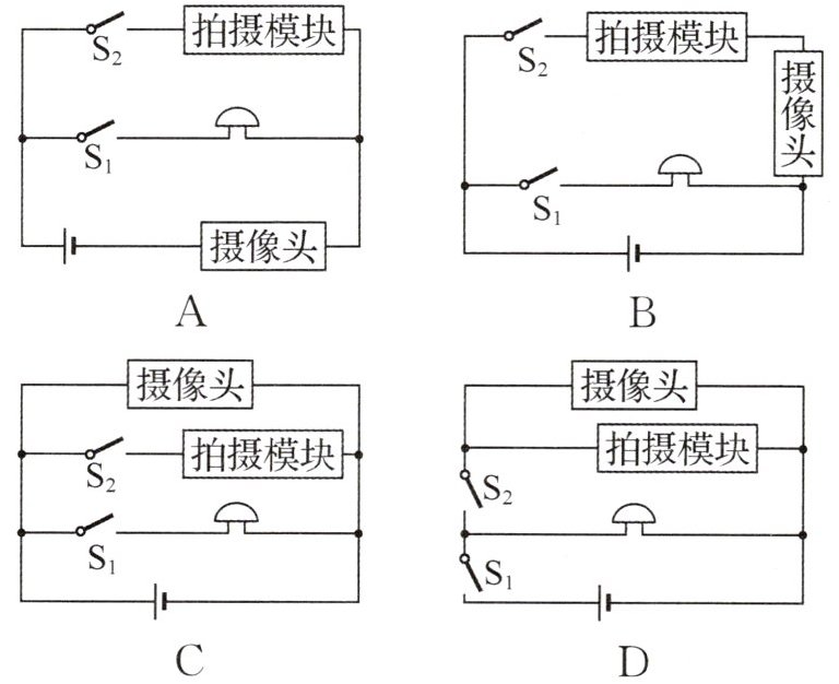 和门铃的功能,守护居住安全.接通电源后,摄像头24小时监控;访客按下门铃按钮,对应开关$S_{1}$闭合,铃声响起提醒户主;该可视门铃还有人形检测功能,检测到人形时,对应开关$S_{2}$闭合,拍摄模块智能抓拍徘徊人员.下列电路图中符合要求的是 ()