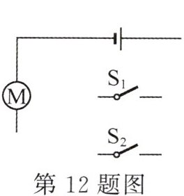 12. (2025·广东佛山期末)某商场的电动扶梯只在白天且有人搭乘时开启.如图所示,利用自动开关$S_{1}$(有人时闭合,无人时断开)及自动开关$S_{2}$(白天闭合,夜间断开)即可实现该电动扶梯(用M表示)的自动控制.请你根据上述要求将电路图补充完整.