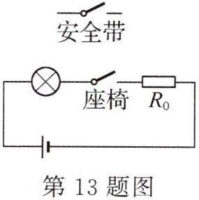 13. (2025·陕西榆林二模)汽车的座椅和安全带插口相当于两个开关,当坐在座椅上时,座椅开关闭合,指示灯亮提醒乘客未扣上安全带,当安全带插入插口时,安全带插口开关闭合,指示灯熄灭;$R_{0}$是防止电路短路的元件,请根据以上实际应用,连接符合要求的电路图.