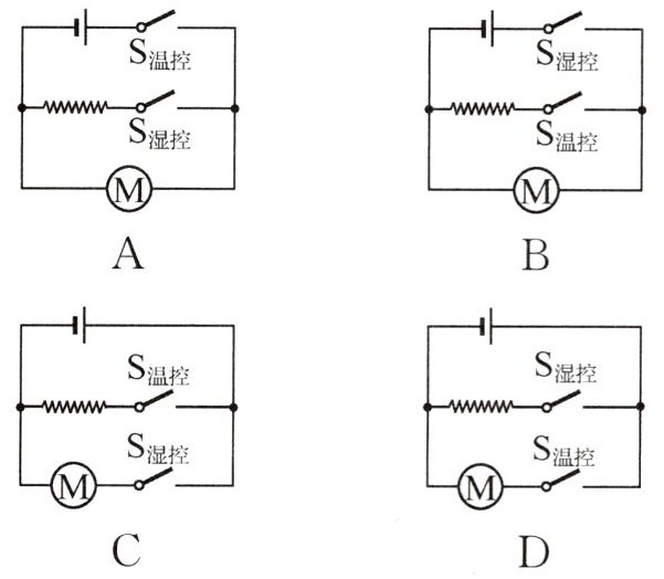 B 解析:由题意可知,将湿的厨余垃圾倒入垃圾桶,电路检测到桶内垃圾湿时,就吹风.吹风过程中,当桶内温度低时,吹热风,当桶内温度高时,吹冷风,即在这个电路中,吹风电机M和电热丝是并联的,且电热丝要受开关 $ S_{温控} $ 控制,而开关 $ S_{湿拉} $ 要控制整个电路,应接在干路中,故B符合要求.