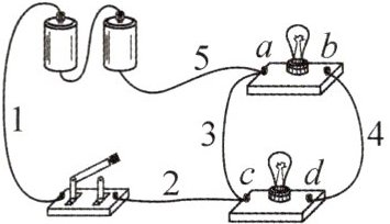 解析:图中开关闭合后,电源会被短路,电路连接错误,要使两灯并联,即电流的路径有两条,可以将导线2由与c接线柱连接改为与d接线柱连接,也可以将导线5由与a接线柱连接改为与b 接线柱连接.