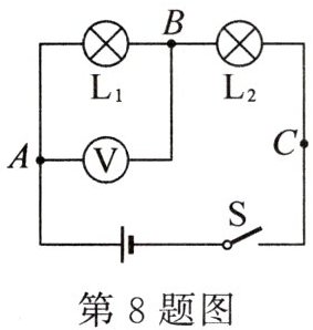 8. 新素养 科学思维 如图所示,灯$ L_1 $与$ L_2 $串联接在由三节蓄电池组成的电源两端,先用电压表测灯$ L_2 $两端的电压,然后又测出了灯$ L_1 $两端的电压为 2.6 V,在测电源电压时,他发现只将电压表接 B 的一端改接 C 会更简单,这种接法______(选填“正确”或“不正确”),理由是______.