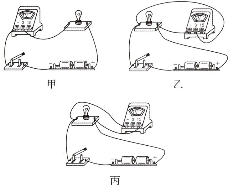 10. 如图所示,用电压表测量小灯泡两端的电压,指出甲、乙、丙三图中电压表的使用错误.