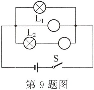 9. 在如图所示电路的圆圈内填入电压表或电流表的符号,使开关 S 闭合时两灯都能发光且两个电表均有示数.