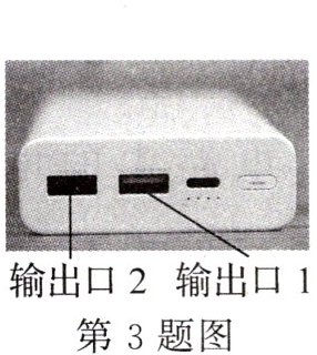 3. (2025·广东汕头期中)如图所示的充电宝上有两个输出口,可同时给两部手机充电,充电宝两个输出口的连接方式是____联.若输出口1正在为一部手机充电,再把另一部手机接入输出口2,则此时输出口1的电流____(选填“变大”“变小”或“不变”,下同),充电宝输出的总电流____.