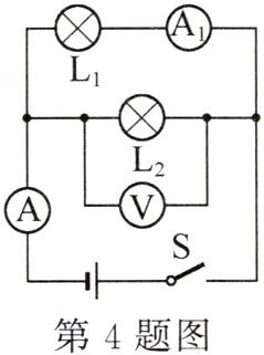4. 如图所示,电源电压为3V,闭合开关S后,电流表A的示数为0.54A,电流表$A_{1}$的示数为0.2A,则通过小灯泡$L_{2}$的电流为____A,电压表V的示数为____V.