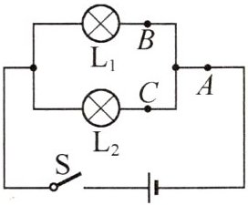 2. (2025·北京期末)如图所示,把两个规格不同的小灯泡$L_{1}$、$L_{2}$接入电路中,闭合开关S,用电流表测出通过A、B、C三点的电流分别为$I_{A}$、$I_{B}$、$I_{C}$.则下列关系式正确的是()