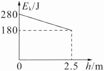 A 解析:由图可知,铅球落到地面时的动能最大,为 280 J,此时其重力势能为零,所以铅球的机械能为 280 J,不计空气阻力,则整个运动过程中铅球的机械能不变.由图知当铅球距离地面高度为 2.5 m 时,动能为 180 J,此时铅球的重力势能为 $ 280 \mathrm { J } - 180 \mathrm { J } = 100 \mathrm { J } $,因为铅球出手高度 $ h $为 2 m,所以铅球出手时其重力势能为 $ \frac { 2 \mathrm { m } } { 2.5 \mathrm { m } } \times 100 \mathrm { J } = 80 \mathrm { J } $,故 A 正确.
