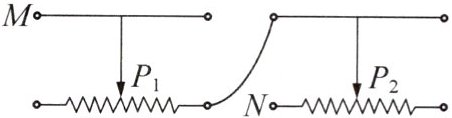 5. 如图,将两个滑动变阻器串联起来,若将 M、N 两个接线柱接入电路后,使这两个滑动变阻器接入电路的总电阻值最大,则滑片 $ P_1 $ 和 $ P_2 $ 应放在()