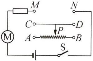 解析:滑动变阻器应“一上一下”接入电路,当下接线柱接 $A$ 时,$AP$ 部分接入电路,滑片 $P$ 由左向右移动时,滑动变阻器连入电路的电阻变大,对电流的阻碍作用变大,则电动机转速将变慢;当下接线柱接 $B$ 时,$BP$ 部分接入电路,滑片 $P$ 由左向右移动时,滑动变阻器连入电路的电阻变小,对电流的阻碍作用变小,电动机转速将变快,故 $A$ 错误、$D$ 正确。滑动变阻器同时接上面两个接线柱是把金属杆接入电路,相当于接入一根导线,同时接下面两个接线柱是把所有的电阻丝接入电路,相当于接入一个定值电阻,这两种接法都不能通过移动滑片改变电阻,对电流的阻碍作用不变,电动机的转速不变,故 $B$、$C$ 错误。