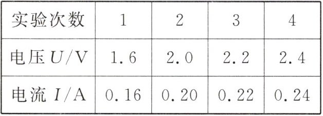 ④ 由表格数据计算$\frac{U}{I}$,$\frac{1.6V}{0.16A}=10\Omega$,$\frac{2.0V}{0.20A}=10\Omega$,$\frac{2.2V}{0.22A}=10\Omega$,$\frac{2.4V}{0.24A}=10\Omega$,即电压与电流的比值是定值(电阻一定),根据正比例函数$y = kx$($k$为常数)的形式$I=\frac{1}{R}U$($R$为定值),所以电阻一定时,电流与电压成正比。