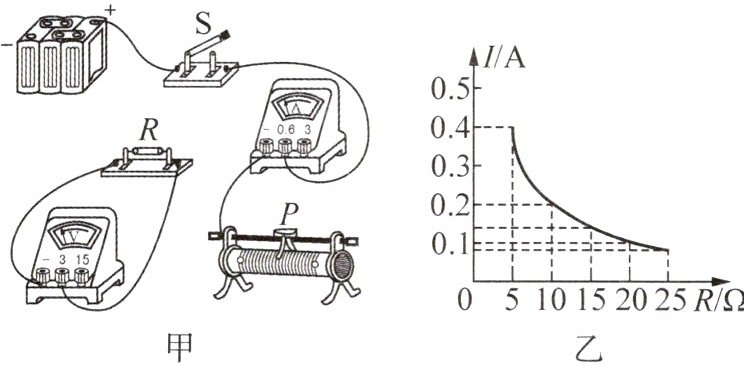 (2) 图乙是根据测得的实验数据绘制的电流I随电阻R变化的图像,由图乙可知,R两端的电压为____V;当R的电阻由5Ω更换为10Ω时,闭合开关,应该将滑动变阻器的滑片P向____(选填“左”或“右”)端滑动;要完成该实验,滑动变阻器的最大阻值至少是____Ω;由图像得到实验结论:当____一定时,导体中的电流与导体的电阻成____.