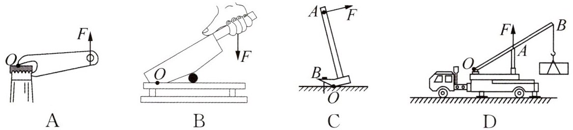D 解析:开瓶器在使用过程中,动力臂大于阻力臂,属于省力杠杆,故A不符合题意;铡刀在使用过程中,动力臂大于阻力臂,属于省力杠杆,故B不符合题意;羊角锤撬钉子过程中,动力臂大于阻力臂,属于省力杠杆,故C不符合题意;起重机在吊起重物的过程中,动力臂小于阻力臂,属于费力杠杆,故D符合题意.