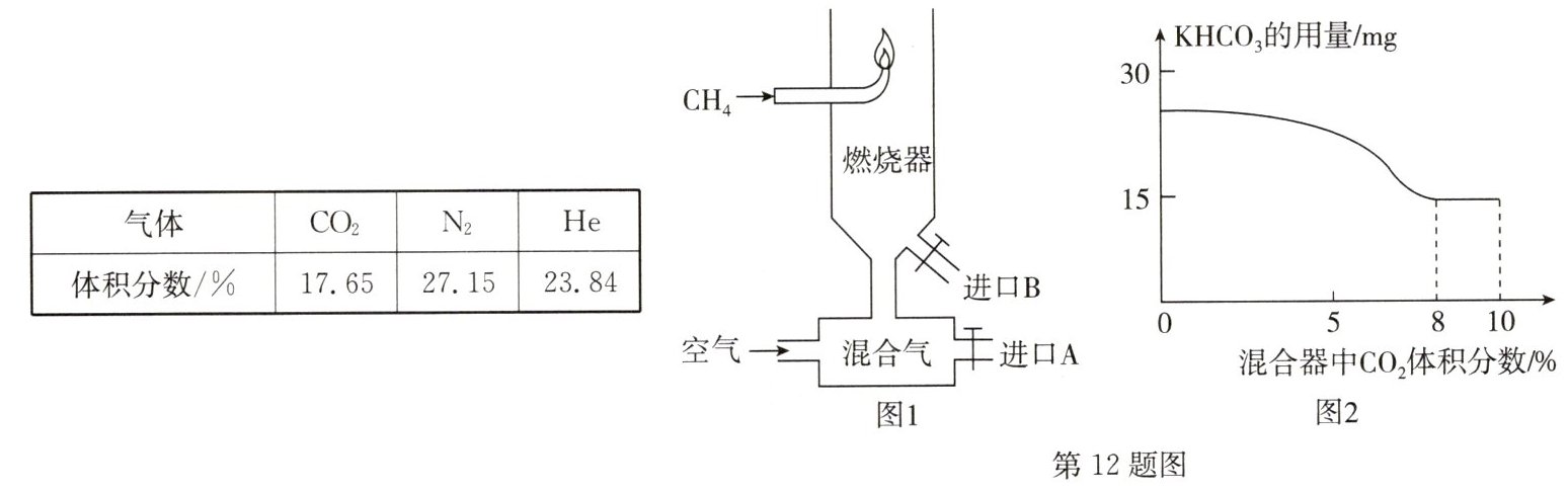 。②向燃烧器内通入 CH₄和空气,点燃,待火焰稳定后,从进口 A 通入 CO₂,进口 B 加入 KHCO₃粉末。控制其他条件不变,测得火焰刚好熄灭时,KHCO₃的用量与混合器中通入的 CO₂体积分数的关系如图 2 所示。CO₂体积分数在 8%~10%内,随 CO₂体积分数的增加,使火焰熄灭所需的 KHCO₃用量不再减少,原因是