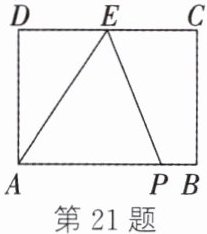 21. (分类讨论思想)如图,在长方形$ABCD$中,$AB = 4cm$,$BC = 3cm$,$E为CD$上一点,且$DE = CE$,动点$P从点A$出发,以每秒$1cm的速度沿A→B→C→E$运动,最终到达点$E$.若点$P运动的时间为x s$,则当$x = $______时,三角形$APE的面积为5cm^{2}$.