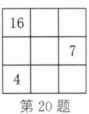 20. (2023·德阳)在初中数学文化节游园活动中,被称为“数学小王子”的小明参加了“智取九宫格”游戏比赛,活动规则是:在九宫格中,除了已经填写的三个数之外的每一个方格中,填入一个数,使每一横行、每一竖列以及两条对角线上的$3$个数之和分别相等,且均为$m$.小明抽取到的题目如图所示,他运用初中所学的数学知识,很快就完成了这个游戏,则$m$的值为______.