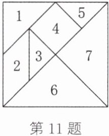 11. (新情境·游戏活动)如图,用“七巧板”的 7 块板能拼成一个正方形,那么能否用其中的 2 块拼成一个正方形? 用 3 块呢? 若能,请画出你的拼法并标明所选板的编号;若不能,请说明理由.