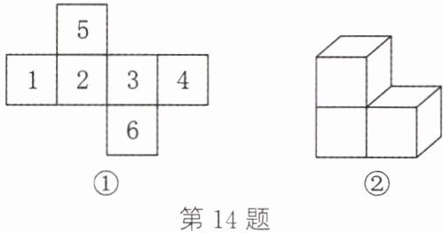 14. (2023·青岛)一个不透明正方体的六个面上分别标有数字1,2,3,4,5,6,其展开图如图①所示.在一张不透明的桌子上,按如图②所示的方式将三个这样的正方体搭成一个几何体,则该几何体能看得到的面上数字之和最小为______.