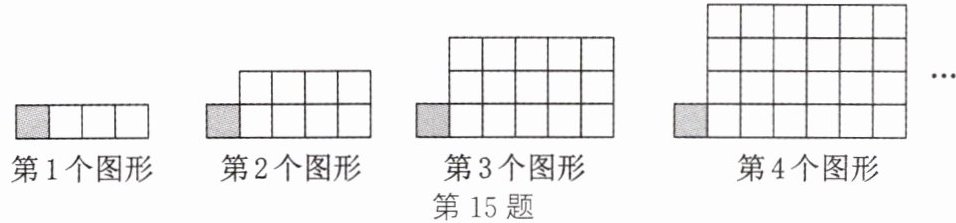 15. (新考法·探究题)用若干灰、白两色的小正方形按如图所示的方式摆放,依此规律,第n个图形中小正方形的总个数为______;若第n个图形中白色小正方形的个数记为$S_{n}$,计算$(1+\frac{1}{S_{1}})×(1+\frac{1}{S_{2}})×(1+\frac{1}{S_{3}})×…×(1+\frac{1}{S_{20}})$的结果为______.