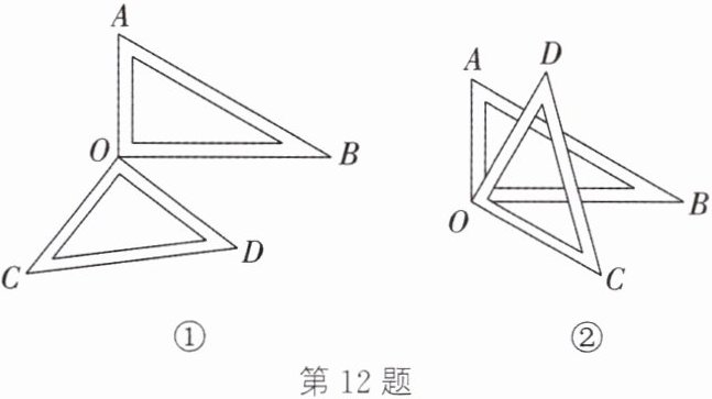 12. (1) 如图①,将一副直角三角尺的直角顶点重合在点 $O$ 处.